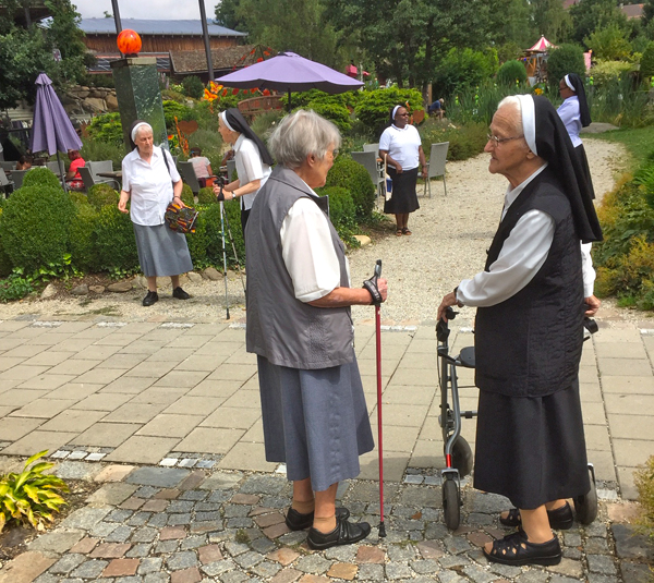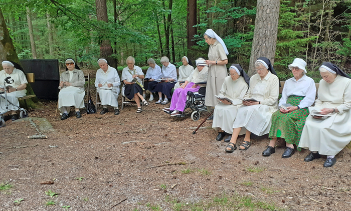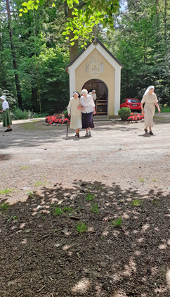 Am 19. August unternahmen die Schwestern des Klosters Strahlfeld ihren Jahresausflug. Dieses Mal ging es in das Glasdorf Arnbruck, das im Zentrum der Glasstraße liegt, eingefügt in die wunderbare Landschaft des Zellertales. Ungefähr dreißig Schwestern folgten der Einladung – einige nahmen ihre Rollatoren oder Wanderstöcke mit. Die Familie Weinfurtner hatte die Schwesterngruppe zu Kaffee und Kuchen oder auch einem Eis ins Cafe eingeladen. Ein großzügiges Angebot, das dankend angenommen wurde. Als Überraschung für die vielen anderen Gäste sangen und trommelten vier junge Schwestern aus Kenia, Sambia und Simbabwe. Das fand großen Anklang, und es versammelte sich eine Schar von ZuhörerInnen um die musikalische Gruppe. |