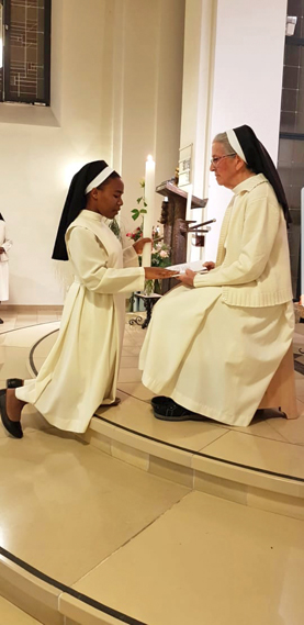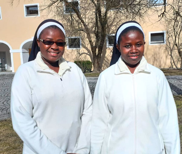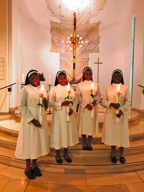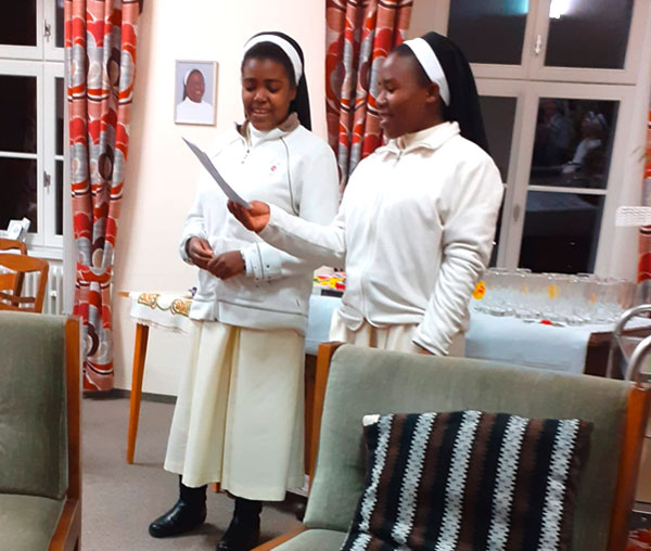 Mitte Januar erhielt das Kloster St. Dominikus in Strahlfeld "Zuwachs" aus Sambia: Sr. Hope Mubanga und Sr. Mary Banda. Beide mussten zuerst in Quarantäne und nahmen dann für zwei Wochen an einem Intensivkurs in Deutsch teil. Da sie schon in Sambia Deutschunterricht erhalten haben, müssen sie nicht am Nullpunkt anfangen. So konnten sie sich in einer kleinen Willkommensparty in gutem Deutsch vorstellen und etwas über ihre Familie und Schulbildung sagen. Ganz schön war es, als sie zwei Lieder sangen, davon sogar eins in Deutsch. Ihre Begeisterung über ihr Dasein in Deutschland war ihnen deutlich anzumerken und die Freude, die sie ausstrahlten war in der Tat ansteckend. In einer feierlichen Vesper am Fest Maria Lichtmess waren sie zuvor offiziell in die Deutsche Region aufgenommen worden und hatten als Symbol für ihren missionarischen Einsatz in Deutschland ein Licht überreicht bekommen. So wie das Licht Helligkeit verbreitet, sollen auch sie zum Licht in ihrem neuen Wirkungsfeld werden. Das Einleben und zuhause fühlen wird ihnen wahrscheinlich nicht schwerfallen. Wir wünschen Sr. Hope und Sr. Mary ein bereicherndes und frohes Jahr in Strahlfeld.